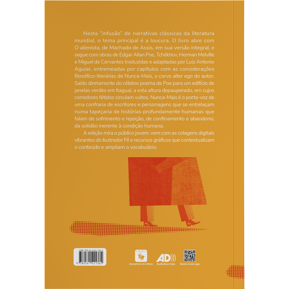 Nesta “infusão” de narrativas clássicas da literatura mundial, o tema principal é a loucura. O livro abre com O alienista (em sua versão integral) e segue com obras de Edgar Allan Poe, Tchékhov, Herman Melville e Miguel de Cervantes traduzidas e adaptadas por Luiz Antonio Aguiar e entremeadas por capítulos com as considerações filosófico-literárias de Nunca-Mais, o corvo alter ego do autor, porta-voz de uma confraria de escritores e personagens que se entrelaçam numa tapeçaria de histórias sobre sofrimento, rejeição, confinamento, abandono e a solidão inerente à condição humana. A edição mira o público jovem: vem com ilustrações do Fê e notas que contextualizam o conteúdo e ampliam o vocabulário.