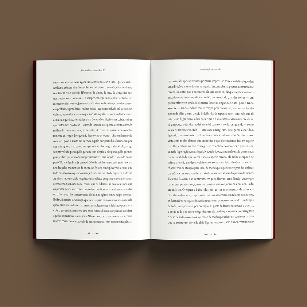 Esta coletânea reúne cinco contos de Kafka que trazem animais como protagonistas. Em comum, são colocadas em xeque as convenções burocráticas, familiares e sociais que asfixiam a vida humana. Em “Um relatório para uma academia” e “Investigações de um cão”, o autor tcheco reinventa os recursos da fábula para questionar nossa prepotência perante as demais espécies. Em “O abutre” e “Chacais e árabes”, Kafka aborda a relação entre os seres mais fortes e mais fracos em tom de parábola. Já em “Josephine, a cantora ou o povo dos camundongos”, com traços de fábula e parábola, é narrada a história de uma artista inserida numa comunidade de trabalhadores explorados e sem tempo para nada.