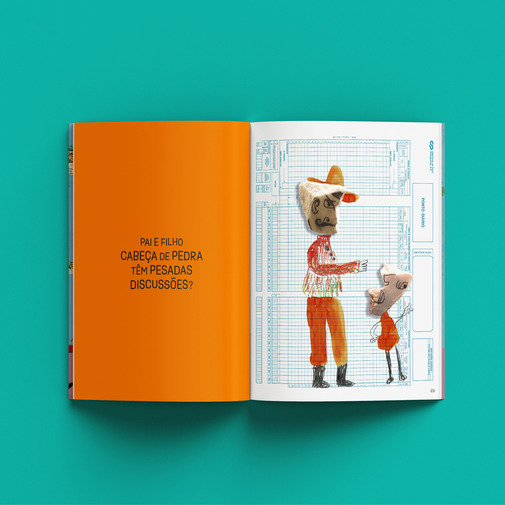 Pensando nisso, a autora colocou cada pedra sobre uma ficha e, com lápis grafite e tinta laranja, deu vida às personagens, imaginou quais seriam suas questões mais íntimas e criou um mundo novo de significados para perguntas aparentemente simples, como: uma menina cabeça de pedra tem pensamentos pesados? Pode uma dona cabeça de pedra ter um coração mole? Um pássaro pode ensinar uma cabeça de pedra a voar?