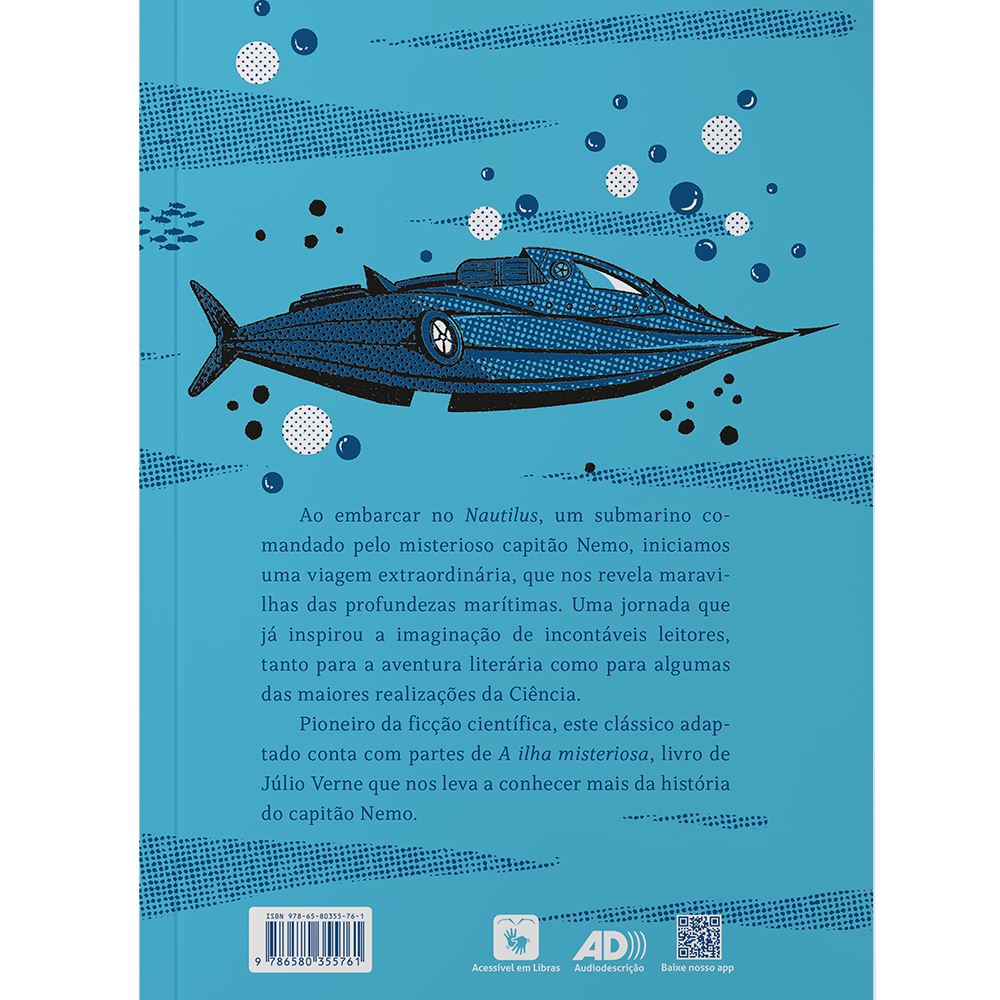 Pioneira da ficção científica, a obra de Júlio Verne foi magistralmente adaptada por Luis Antonio Aguiar. Essa versão traz, ainda, uma novidade. Ela conta com partes de A ilha misteriosa, outro livro do escritor francês, que nos leva a conhecer mais da história do capitão Nemo.